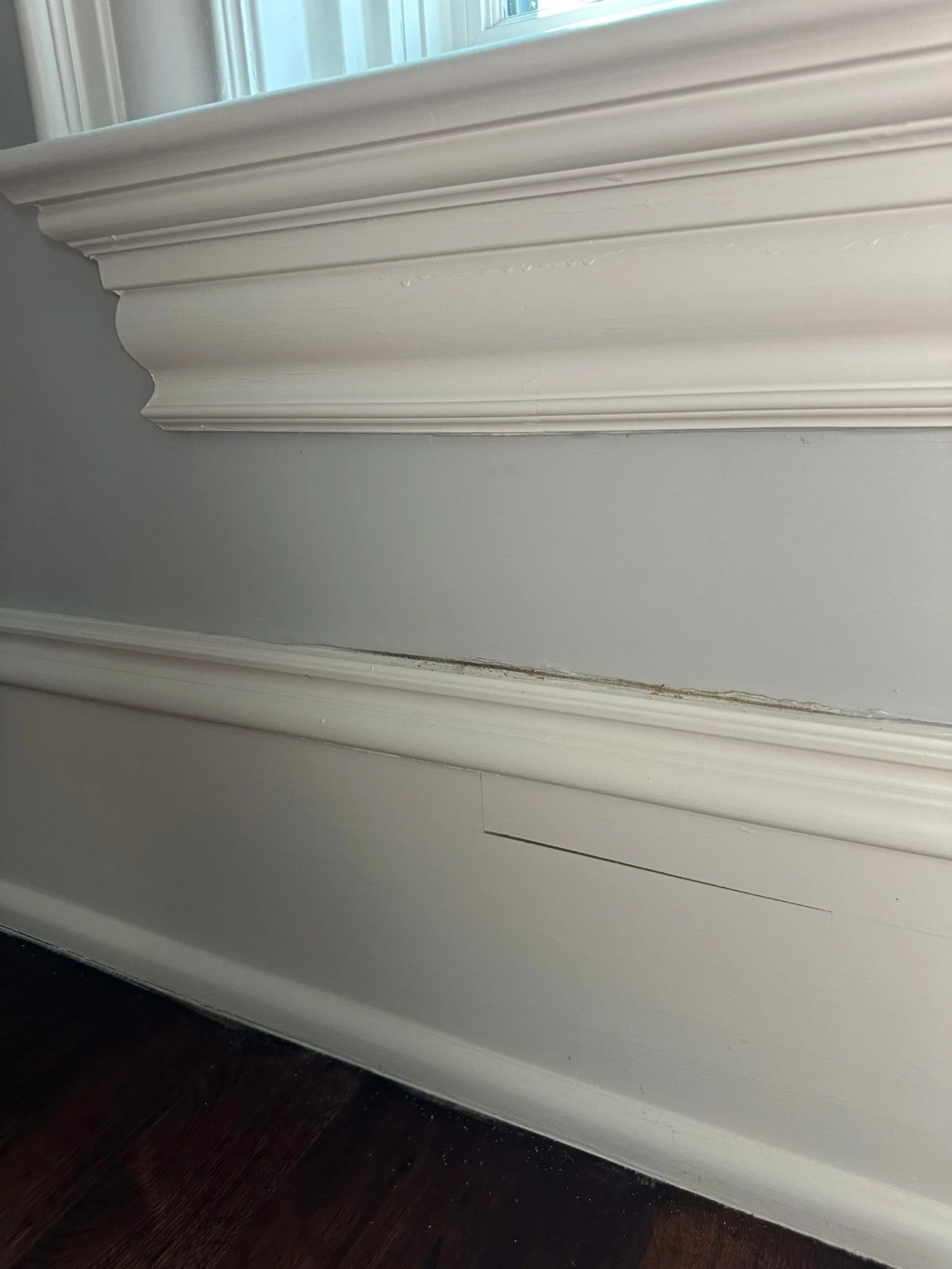 1. Any visible water damage. Look for peeling paint, bubbling on walls, discoloration, or any water stains. Look at ceilings, under sinks, around windowsills (what we noticed is cracking in the paint and trim….we also noticed certain areas that felt slightly damp to the touch…another sign to look for is condensation on the windows themselves.)Chimney chases are also good to be aware of — notice the walls behind or around them. In general, pay attention to any place that could be a potential water entry. You can even pay attention to silly things like mirrors (if glued to walls in bathrooms with showers) because moisture can get locked in behind them. Sadly, we had this issue in our master bath. It was one of the easier fixes, but we still had to remove all the drywall behind and install new drywall.